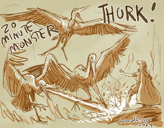 Bumblebore sprang into action and cast Sleep. This effected many of the Kenku, causing them to fall 20' to the floor, take 2d6 damage, and wake up again. Though they were no longer asleep the creatures couldn't attack until the next round, where Bumblebore followed up with a breath weapon attack from O'Malfoy that wiped them (and some of Sever's and Giuseppe's hit points) out. Slippery Pete unwound his makeshift lasso and swung it up at King Vultan, the thief's ample dexterity plus a good roll making up for his lack of weapon proficiency and he brought their enemy down into the middle of their formation (later I read in UA that thieves can't use a lasso...). Giuseppe then pummelled the "Hawkman King" into oblivion, where upon the body shifted back into the form of a Kenku.